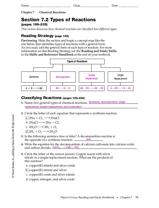 In this type of reaction, two or more reactants combine to synthesize a product. Types of chemical reaction worksheet practice answers. Those types are synthesis (or direct combination), decomposition, single replacement, double replacement (or metathesis), and combustion. Chemical reaction packet study guide study guide for each of the following chemical reactions, write a word equation, a skeleton equation, and a balanced chemical … Predict if the combinations of reactants in a—c/ will result in a chemical reaction.
